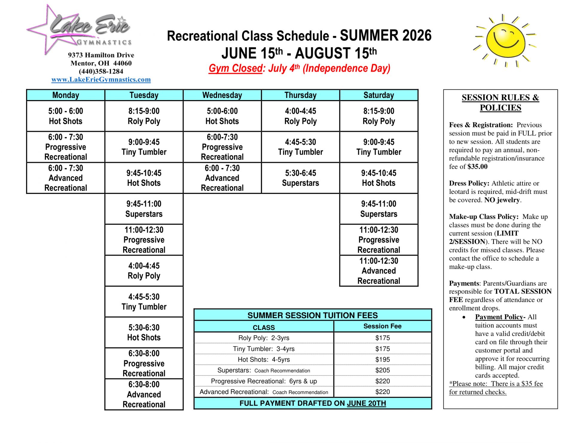 *Parents/Guardians are responsible for the TOTAL SESSION FEE regardless of attendance or enrollment drops.